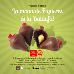 Aquest 2021, la mona de Figueres és la baldufa icònica del Museu del Joguet de Catalunya, transformant-la en una baldufa de xocolata que en el seu interior porta una autèntica baldufa de fusta: us convidem a moure-la i a escoltar la particular musiqueta que fa! La baldufa és l'objecte que han triat els mestres pastissers associats a Comerç Figueres amb la tutela del Museu del Joguet de Catalunya, i que es converteix en la mona representativa del 2021 durant la Pasqua d'aquest any a la ciutat. La presentació a premsa serà el dimarts 16 de març a les 11 h a les instal·lacions del Museu del Joguet de Catalunya Figueres.